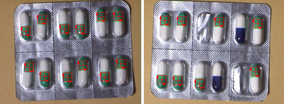 机器视觉检测设备通过模式匹配与颜色识别,确定一个包装是否有正确的数量和类型的药片。检查包装中药丸的数量和每颗药丸的颜色,对不合格包装发出报警或剔除。
