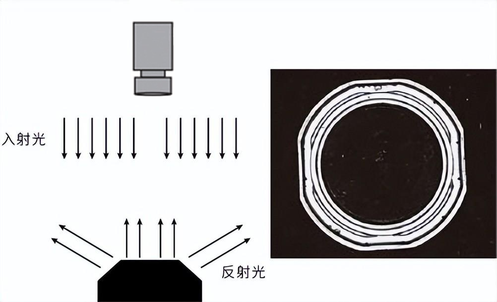 效果分析:光线经过平面反射后,与光轴平行地进入镜头。此时被测物相当于一面镜子,图像体现的是光源的信息,当“镜子”出现凹凸不平时,将格外地明显。