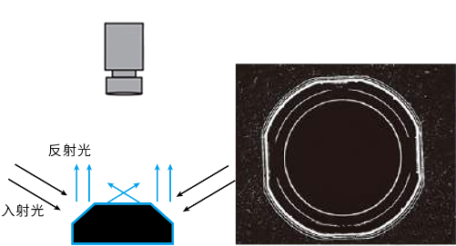 效果分析:高角度照射,光线经被测物表面平整部分反射后进入镜头,图像效果表现为灰度值较高不平整部分反射光进入不了镜头,图像效果表现为灰度值较低。