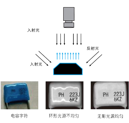 光源位于被测物的上方,光线照射在被测物表面,根据光源的发光角度可分为高角度光源、低角度光源,以及包含高、低角度的无影光源。