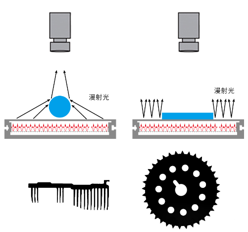 光源位于被测物的下方,无遮档时,光线直接进入镜头,图像灰度值很高;由于被测物遮挡了光线,图像上灰度值很低,所以得到了被测物的轮廓信息。