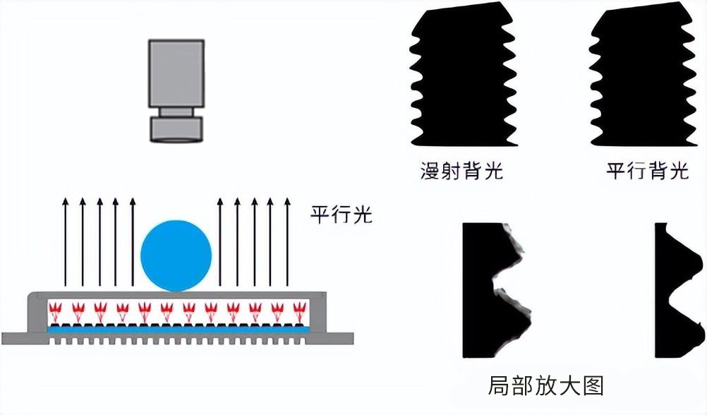 效果分析:平行光能够精确得到不规则被测物的外轮廓,使诸如圆柱形产品,或有倒角、圆角的产品边缘成像清晰、锐利。一般配合远心镜头使用,精度很高。