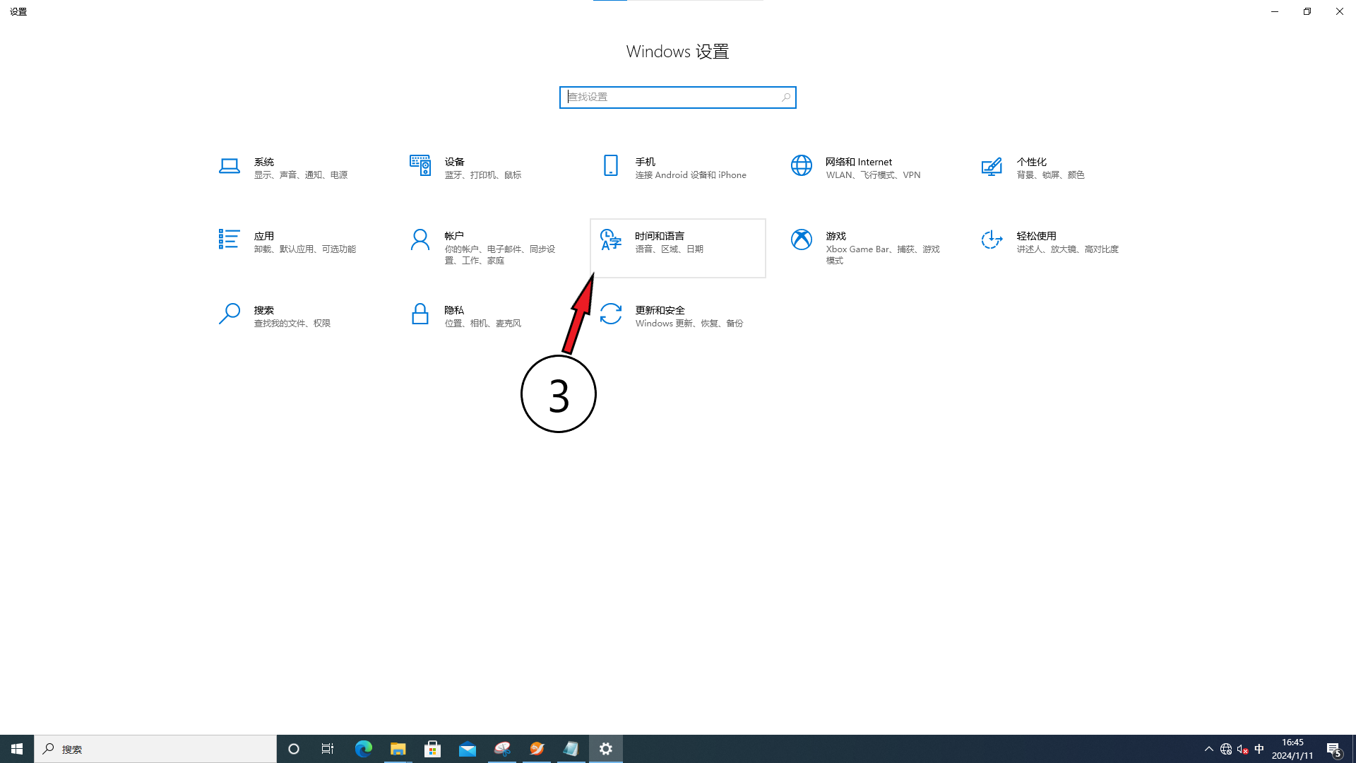 3、点击“时间与语言”