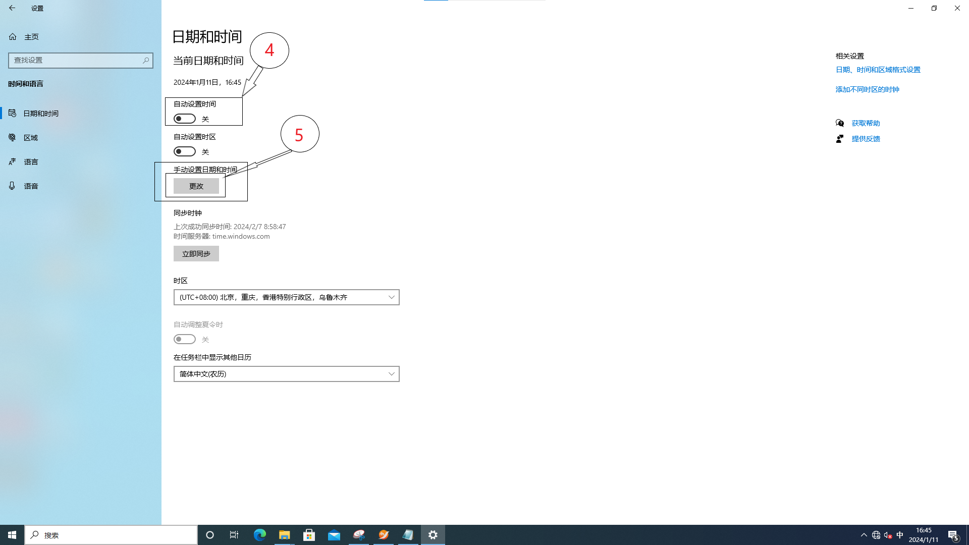 4、关闭“自动设置时间”>>点击“更改”