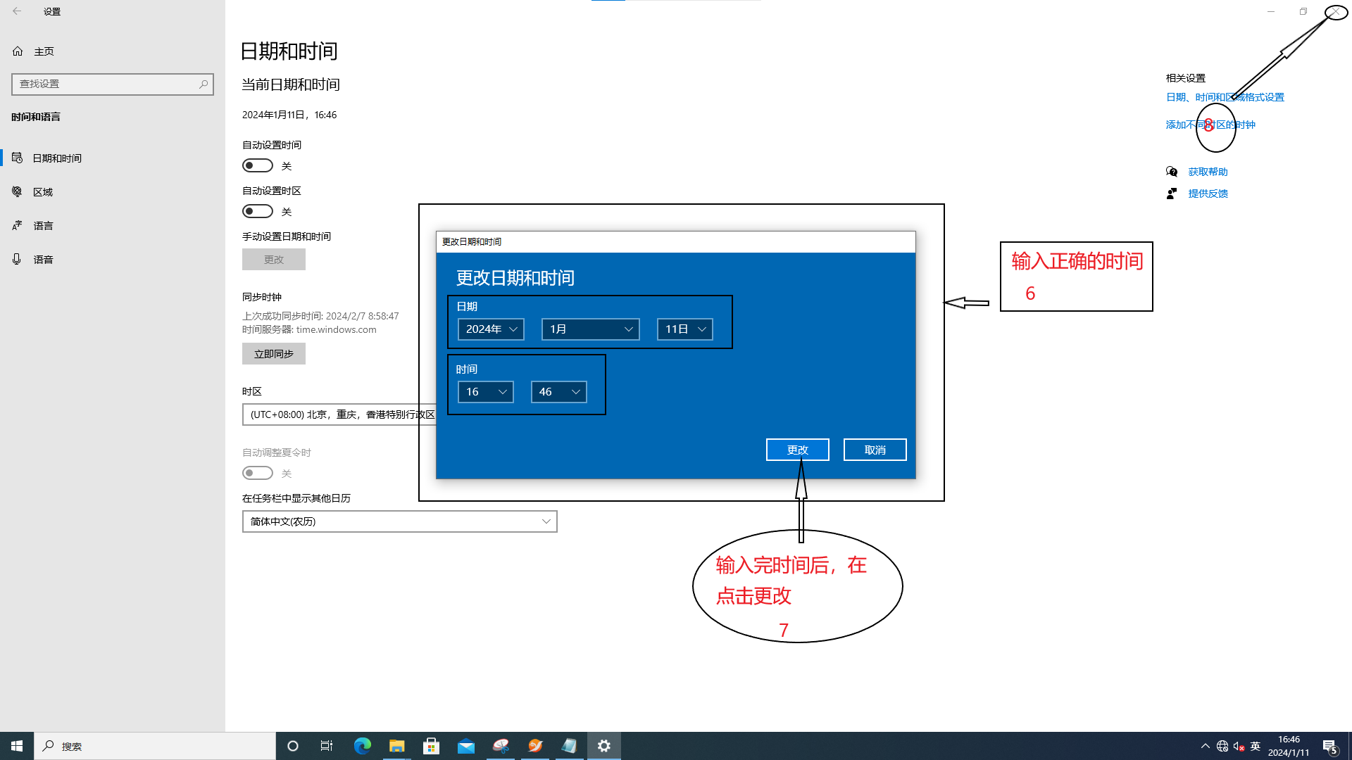 5、将系统时间设置成标准时间 >> 点击“更改”>>点击“X”关闭页面