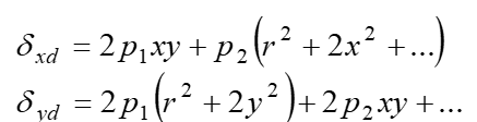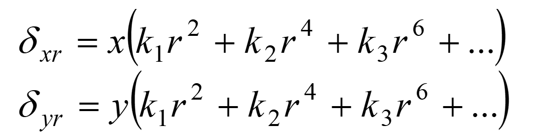 径向畸变主要是由镜头形状缺陷造成的,是关于摄像机镜头的主光轴对称的。正向畸变是枕形畸变,负向畸变是桶形畸变,其数学模型为: