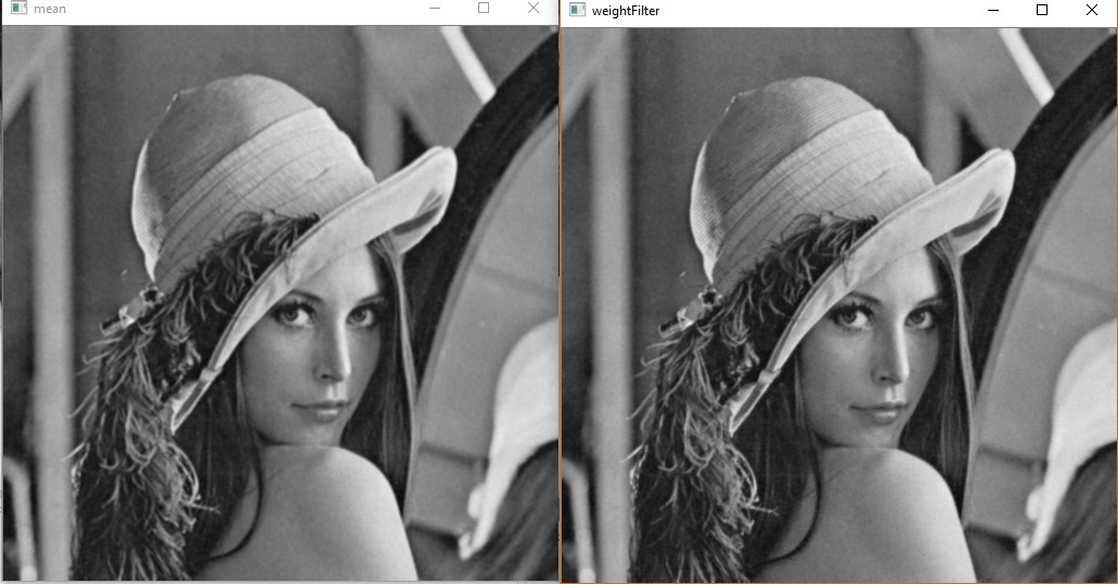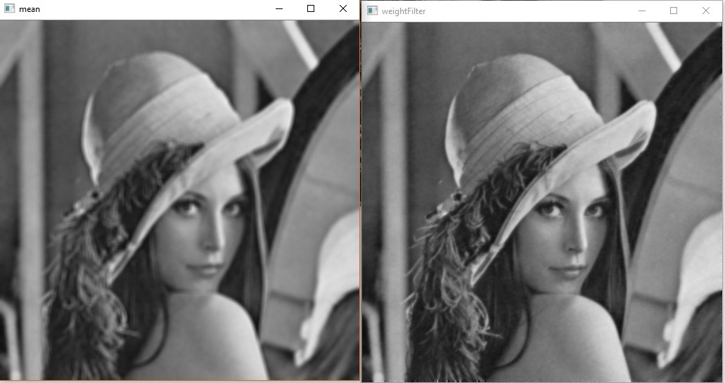 加权的均值滤波器去噪效果和均值滤波器相当,但是在保护图像细节方面比均值滤波器效果要好,上图是3×3的滤波器,窗口较小,两者的区别不是较大。