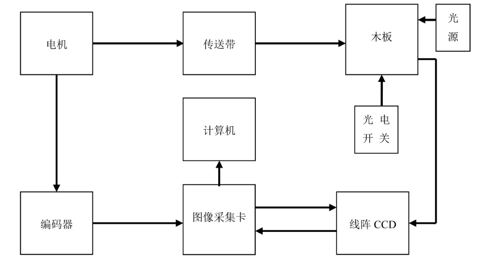 该系统图像采集的工作原理为:木板放在传送带上,传送带靠电机带动以一定大小均匀速度运动,当传送带上的木板通过光电开关时,光电开关被触发并给图像采集卡发脉冲,此时图像采集卡开始读取CCD的数据。