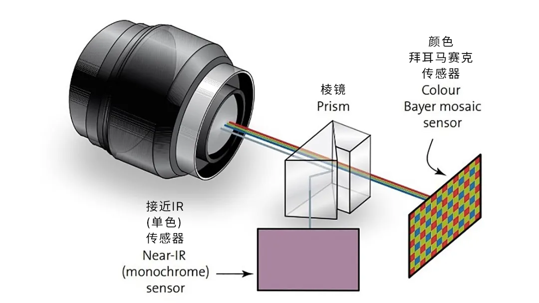 近红外(NIR)波段范围从700nm延伸到1μm。传统的CMOS传感器具有一定的NIR灵敏度,而在850nm以上具有增强灵敏度的版本正变得越来越普遍。NIR可以揭示水果、蔬菜、坚果和肉类等食物中的腐烂、机械损伤和虫害等非表面特征。NIR照明还可以穿透某些染料和油墨,从而可以通过印刷包装检查产品。在木材、纺织、纸张、玻璃、瓷砖和电子工业中也有应用,并用于检查圆柱形物品(如罐头、瓶子、钢笔等)甚至旋转物体上的标签。此外,将脉冲NIR光源与NIR通滤光片结合使用可消除因环境光波动而产生的任何不良影响。如果同时对物体进行NIR和彩色成像很重要,则使用两个单独的相机可能会在获得两个图像之间的准确配准方面存在问题。多传感器棱镜相机是一种强大的替代方案。在这里,棱镜将来自样品的光分离成可见光和NIR波长通道,这些通道配备了单独的传感器,从而为两个图像提供完全相同的视野(图3)。与这些相机一起使用的镜头必须与棱镜的光学特性很好地匹配。在这里,棱镜将来自样品的光分离成可见光和NIR波长通道,这些通道配备了单独的传感器,从而为两个图像提供完全相同的视野(图3)。与这些相机一起使用的镜头必须与棱镜的光学特性很好地匹配。在这里,棱镜将来自样品的光分离成可见光和NIR波长通道,这些通道配备了单独的传感器,从而为两个图像提供完全相同的视野(图3)。与这些相机一起使用的镜头必须与棱镜的光学特性很好地匹配。