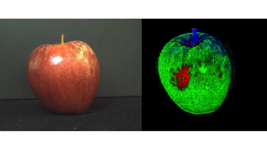 图4.高光谱图像中的红色区域显示彩色图像中不可见的非表面瘀伤