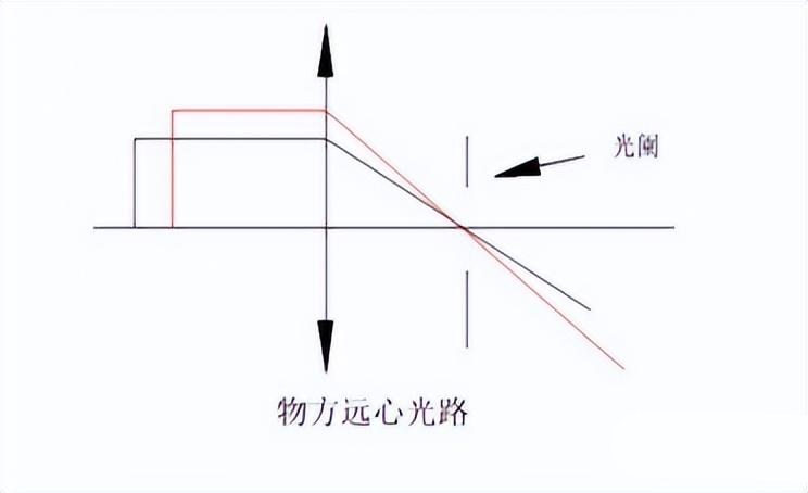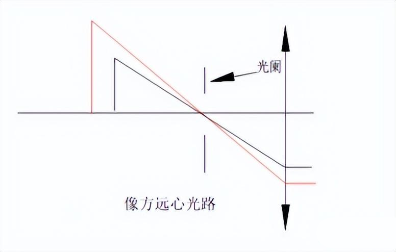 像方远心光路的光路图如下图。它是将孔径光阑放置在物方焦平面上,像方主光线平行于光轴主光线的会聚中心位于像方无穷远。这种镜头的特点是放大倍率与像距无关,可以消除像方调焦不准引入的测量误差。