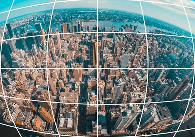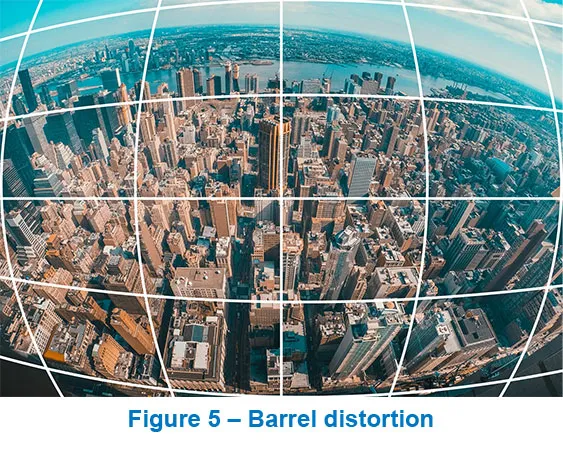 桶形失真(又称桶形畸变)的图像边缘和侧面远离中心弯曲。这在视觉上看起来像是图像中心外凸,因为它捕获到了弯曲视野(FoV)的外观。例如,当在高层建筑的高处使用较短焦距的镜头(又称“广角镜头”)时,可以捕获更宽的FoV。当使用产生极度扭曲和宽FoV的鱼眼镜头时,FoV会实现最夸张的效果,如图5所示。在这张图像中,网格线用于帮助说明失真效果如何使图像向靠近侧面和边缘的地方拉伸。