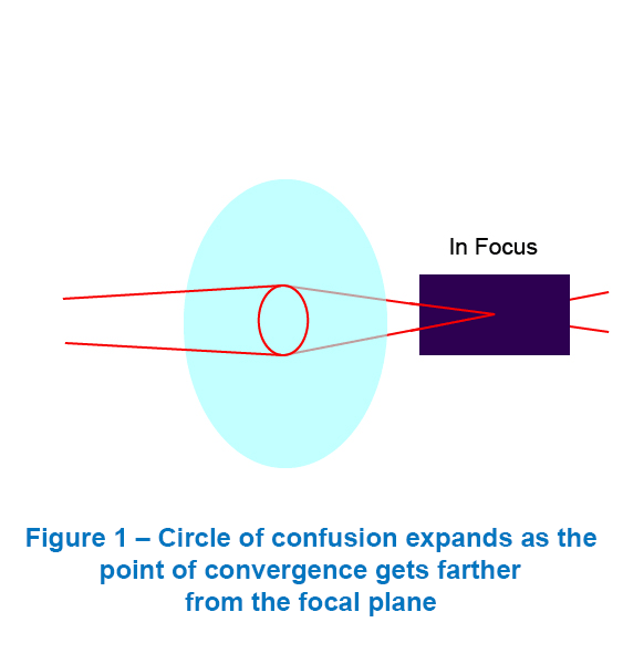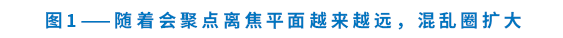 为了解释像差如何使图像模糊,首先需要解释一下:什么是弥散圆?来自目标的光点到达镜头然后会聚在传感器上时,图像会很清晰。但是如果光点会聚于传感器前后,则传感器上的光线会广泛分布、扩散。图1中可以看到这种情况,其中可以看到点光源会聚在传感器上,但随着传感器位置的变化,沿传感器散布的光量也会发生变化。