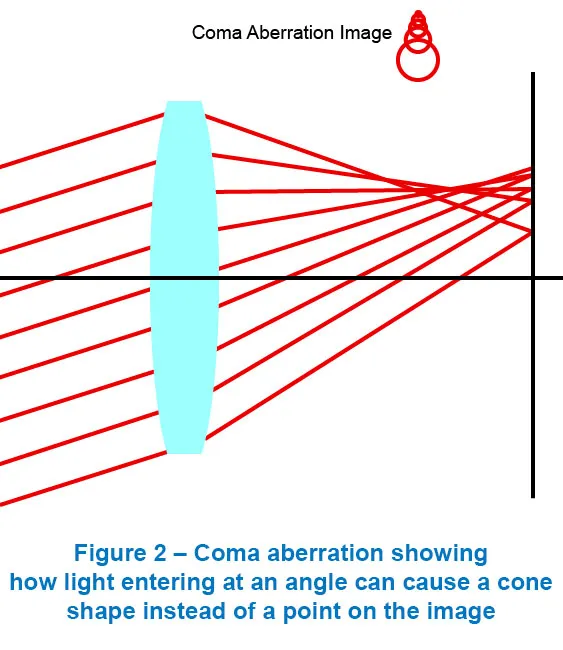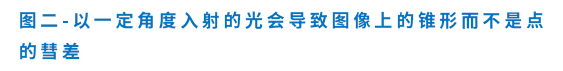 以一定角度进入镜头的光线会导致光线在图像平面上形成不断扩大的弥散圆轨迹。如图2所示,这可能会导致扩大的光线轨迹影响任何试图成像的点光源。在图2顶部,彗差图像可以看作是向下扩大的弥散圆的点光源,形成一个锥形图像。这通常是光学元件未对准的结果。