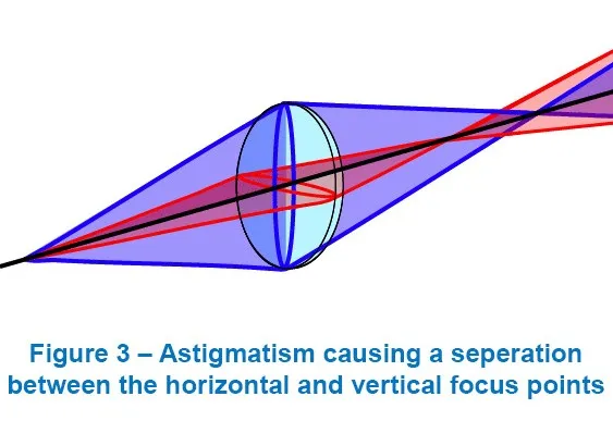 在两个垂直平面上传播的光线聚焦于不同点时会产生散光。从图3中可以看到,其中两个焦点分别用红色水平面和蓝色垂直面表示。图像中的最佳清晰度点将位于这两个点之间,其中一个平面的弥散圆宽度并不大。当光学元件未对准时,散光会导致图像的侧面和边缘出现失真。散光通常被描述为查看图像中的线条时缺乏清晰度。彗差和散光通常是镜头系统内部光学元件发生类似未对准的结果。散光加剧时,肯定也会发生彗差。
