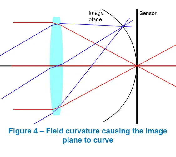 许多镜头都有圆形焦点场。这可能会导致图像出现软角,并主要使图像中心处于聚焦位置。然而,大多数镜头都有些圆形的焦点,如果不进行裁剪,就无法聚焦整个图像。因为大多数镜头光学元件都有曲面。场曲是多个焦点导致图像平面不平产生的结果。图4显示图像平面为曲面,因为每个焦点都位于垂直于光轴的不同平面上。用一条线连接这些点时,会显示出一个曲面。光线离开光轴进入镜头后,焦点并没有聚焦在传感器上。