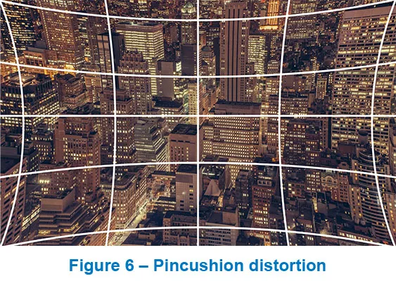 当光线通过枕形失真(又称枕形畸变)向光轴弯曲时,图像似乎向中间“收缩”。因此,图像的边缘和侧面看起来会向图像中心弯曲,如图6所示,其中网格线越往中心弯曲,延伸越远。