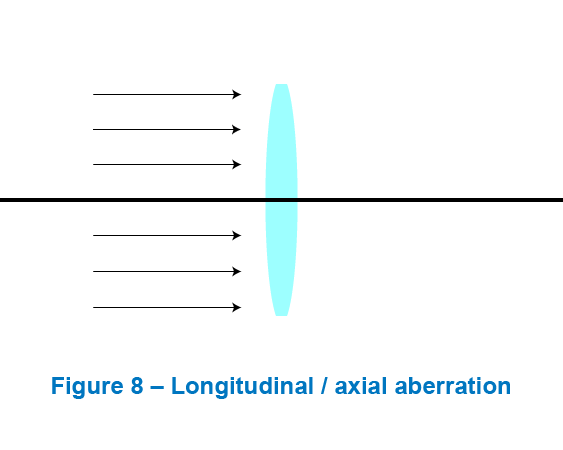 光的颜色代表一种特定波长的光。彩色图像将有多个波长进入镜头并由于折射而聚焦在不同的点。纵向或轴向色差产生的原因是不同波长光线沿光轴在不同点聚焦。波长越短,其焦点就越靠近镜头,而波长越长,则会发生相反情况,即焦点离镜头越远,如图8所示。采用更小的光圈,进入镜头的光线可能仍会聚焦在不同的点,但“弥散圆”的宽度(直径)会大幅减小,避免图像模糊严重。