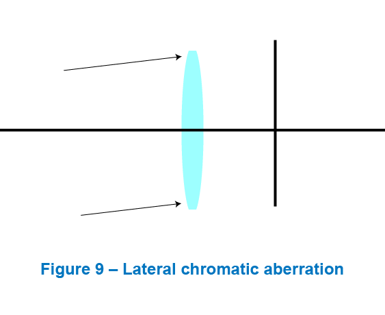 导致不同波长沿图像平面分布的离轴光为横向或侧向色差。这种像差会导致图像主体边缘形成彩色边纹。校正难度比纵向色差更高。