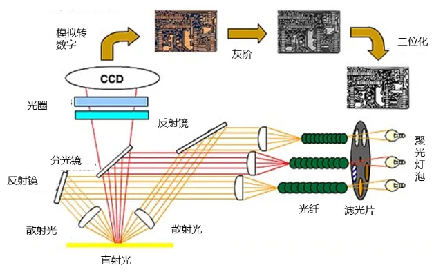 AOI设备主要由照明光源(包括荧光灯、卤素灯和LED灯)、镜头、工业摄像机、视觉分析软件构成。AOI设备工作时,被测目标首先在光源的照射下,反射光进入特定的镜头和摄像机,内部的CCD/CMOS图像传感器向图像采集卡输入信息流,并加工为数字图像,通过机器视觉软件对数字图像加以解析,最终反馈到决策模块和控制执行模块,并对被测目标执行程序操作。