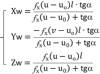 如上图所示,图中显示了3个坐标系,分别为相机坐标系OCXCYC、图像坐标系oxy和世界坐标系OwXwYw。图像坐标系与相机坐标系原点之间的距离为焦距f,图像坐标系与世界坐标系原点之间的距离为l。结构光平面与相机光轴夹角为a,取世界坐标系的原点位于相机光轴与结构光平面的交点,Xw轴和Yw轴分别与相机坐标系XC和YC轴平行,ZW与ZC轴重合,但方向相反,则世界坐标系与相机坐标系有如下关系: