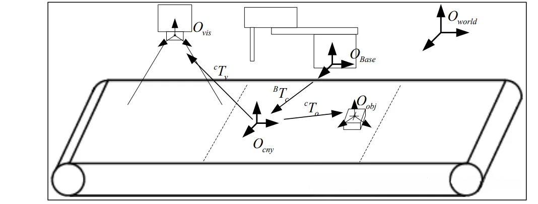 跟随运动以物体坐标系为参考系,物体坐标系(Oobj)是固连在物体上随物体移动的坐标系,是动态坐标系。物体坐标系描述了物体在传送带上的位置和方向,是物体基准点在传送带坐标系下的坐标。传送带坐标系(Ocny)表示传送带在机器人基坐标系下的位置和方向,用于描述传送带与机器人之间的相对关系,传送带坐标系是静态的。传送带视觉中的视觉坐标系(Ovis)描述了相机与传送带之间的位置转换关系。通过相机获得了物体在传送带上的瞬时位置,通过编码器实时获得物体在传送带上的运动量,从而实现机器人对物体位置的实时追踪。跟随工艺中各坐标系之间的关系如下: