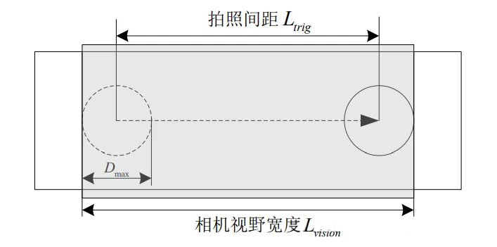 视觉必须在一个拍照周期内完成图像识别,拍照周期=拍照间距/传送带速度,拍照间距设置过小会导致拍照周期变短,要求视觉的处理速度更快,因此在满足不漏拍的前提下拍照间距尽量大。综合各方面需求,拍照间距不能太大也不能太小,可按下列公式给定,其中Ltrig为拍照间距,Lvision为视野宽度,Dmax为物体识别标识最大宽度, 为设置余量。