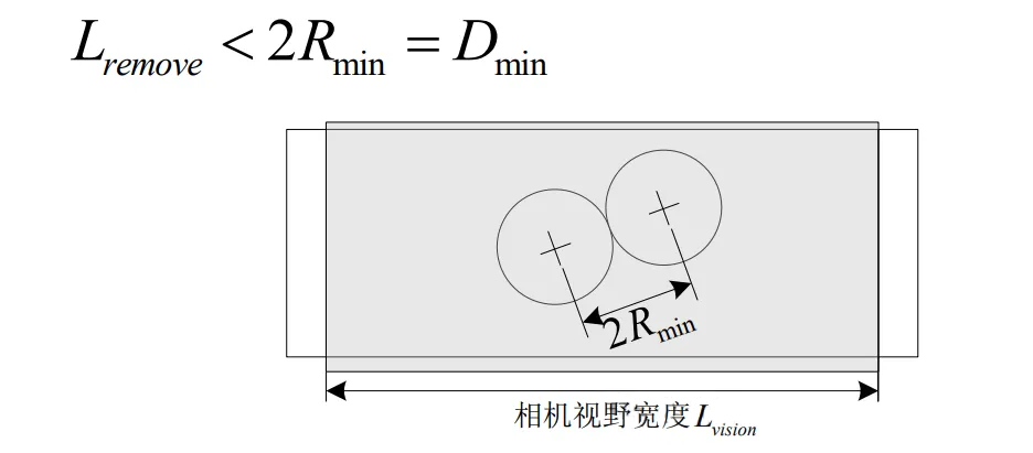 5、重复检测判定距离:按上述拍照间距设置原则,前后两次拍照画面有重叠,这有可能导致同一个物体在前后两次拍照中同时被识别,造成重复,此时需要剔除其中一个。控制器内部会对前后两次拍照物体的位置进行比较,如果两个物体的距离小于重复检测判定距离,认为是重复,剔除后一次拍照得到的物体。重复检测判定距离的设置原则是正确识别重叠的同一物体和正常靠近的两个物体。如下图所示,当两个物体距离大于2Rmin时可认为是两个物体,否则认为是同一个物体,因此重复剔除距离按如下原则设置:
