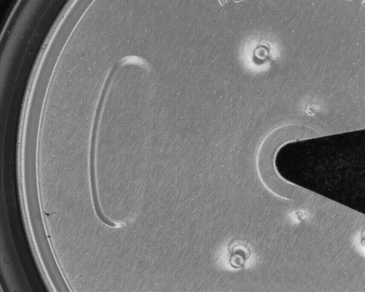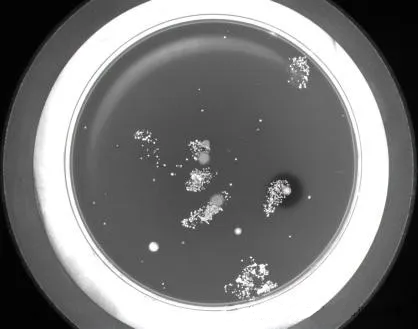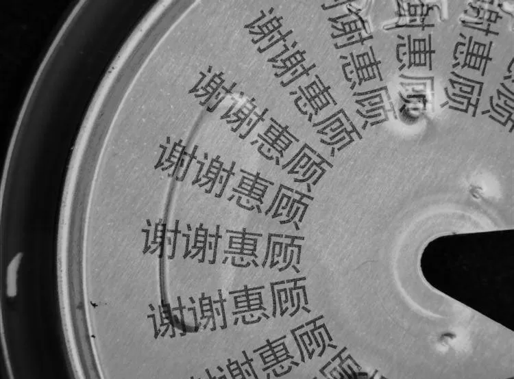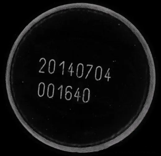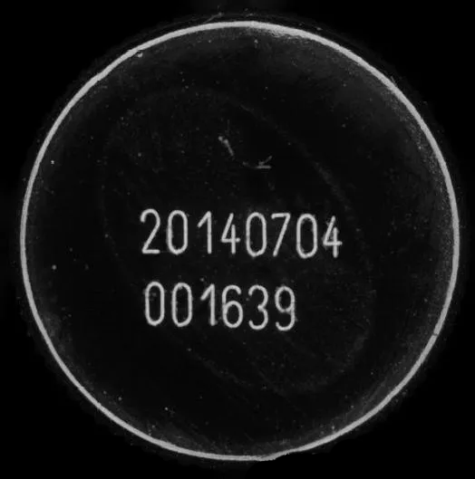 瓶盖上面是黑色,另有红黑交错背景图案,条码为激光刻印显灰色,为了显现出条码,应该将字符打亮,背景与字符分辨明显;我们如果选用红色光源的话,背景中的红色会滤掉打白,会干扰同为白色的字符,所以,我们应该利用光源的互补原理,采用蓝色光源,将红色背景尽量打黑;