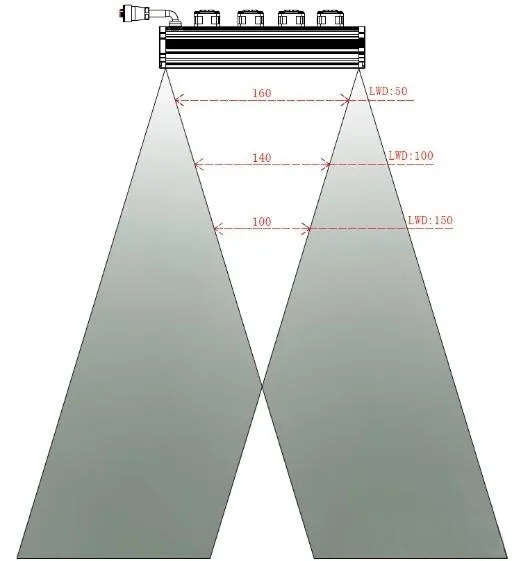 为了让“纵向缺陷”也无处遁逃,可采用交叉线形光源。它可利用特殊的光学设计,使两侧的光线呈一定角度汇集到光源中间位置,凸显纵向缺陷,通过降低背景亮度来提升缺陷的对比度。