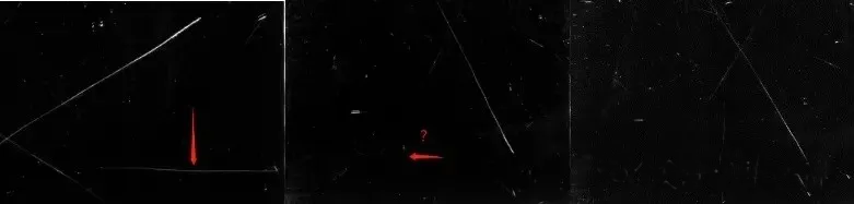 玻璃盖板上的划痕检测结果如图所示,分别是普通线光检测“横向划痕”、普通线光检测“纵向划痕”、交叉线光检测“纵向划痕”,可以看出,使用普通线光源检测“横向划痕”时缺陷可见,使用普通线光源检测“纵向划痕”时缺陷不可见,使用交叉线光源检测“纵向划痕”时缺陷可见。