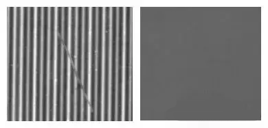左侧为平面条纹光源检“划痕”的效果,可以看到玻璃盖板表面划痕清晰可见。