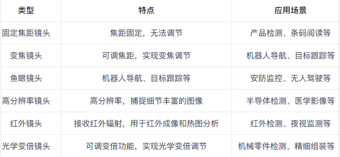 这个表格将不同类型的工业镜头按照特点和应用场景进行分类,方便了解各种镜头的区别和适用范围。请注意,实际市场上还存在其他类型的工业镜头,这里列举的是一些常见的类型。