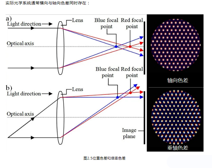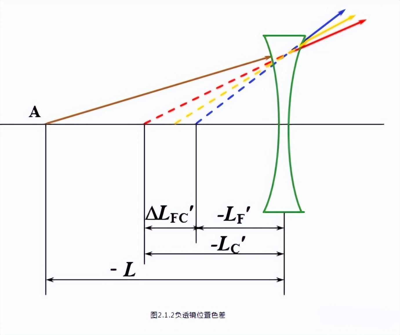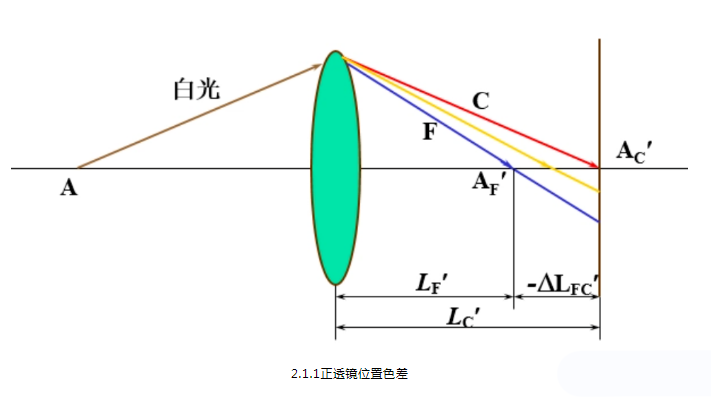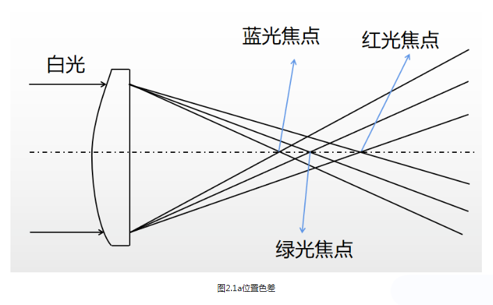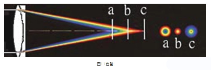 用白光进行成像时,除了每种单色光仍会产生五种单色色差外,还会因不同色光有不同折射率造成的色散,而使不同的色光有不同的传播光路,从而呈现出因不同色光的光路差别而引起的像差,称之为色像差(简称色差)。