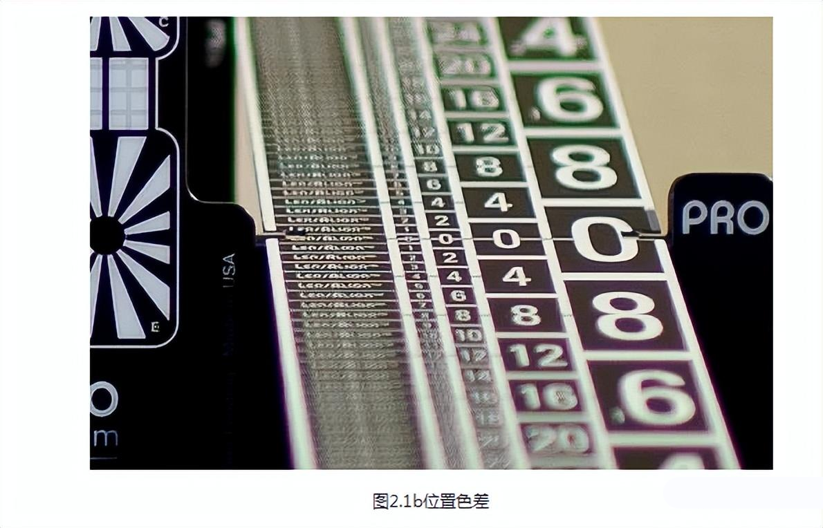 图片上半部分出现了绿色色差,靠近相机的下半部分出现了紫色色差。