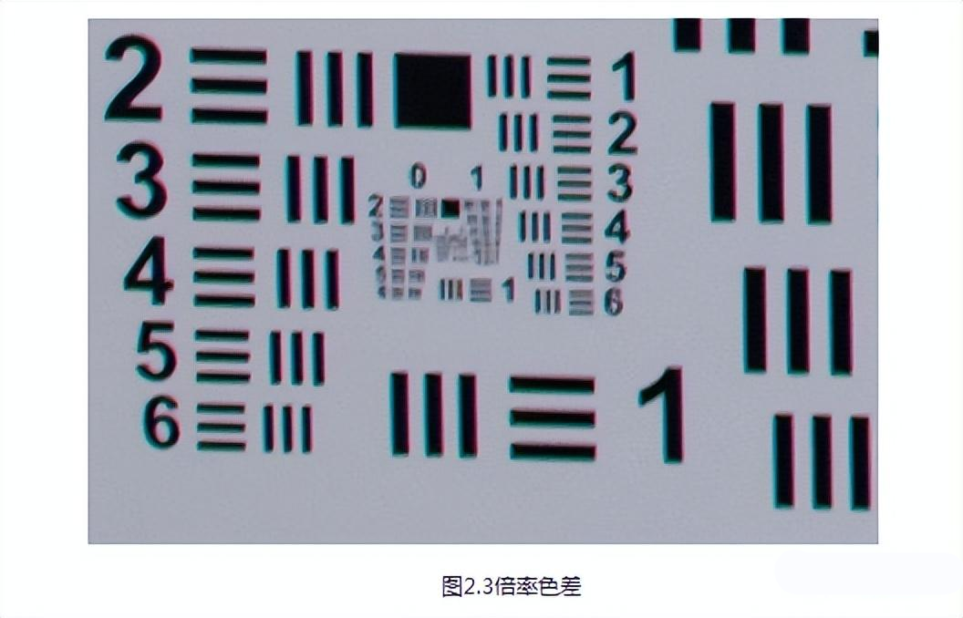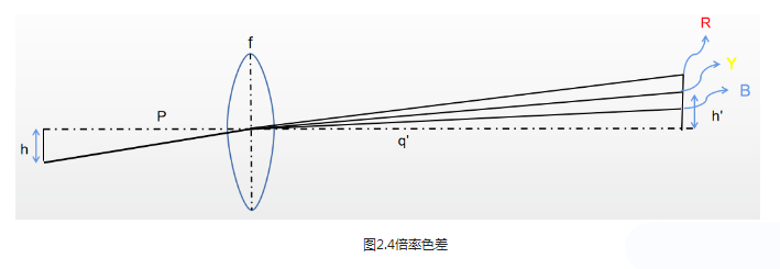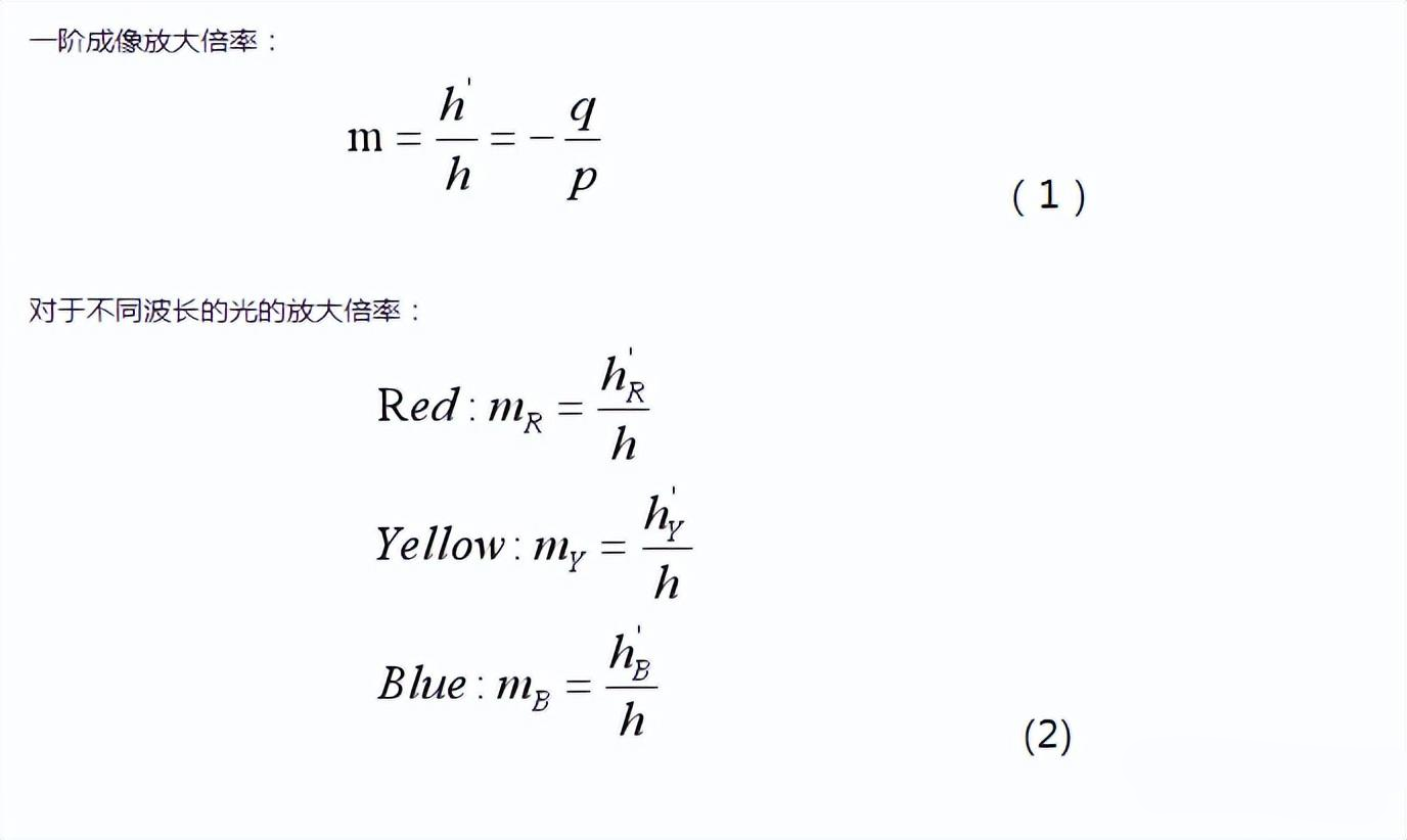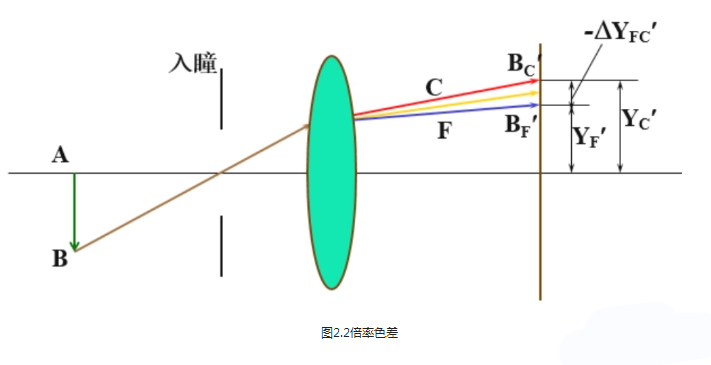 在倍率色差中,由于不同光线波长的折射率不同,导致像平面上不同颜色波长的光线产生横向色散,即不同颜色有不同的放大倍率: