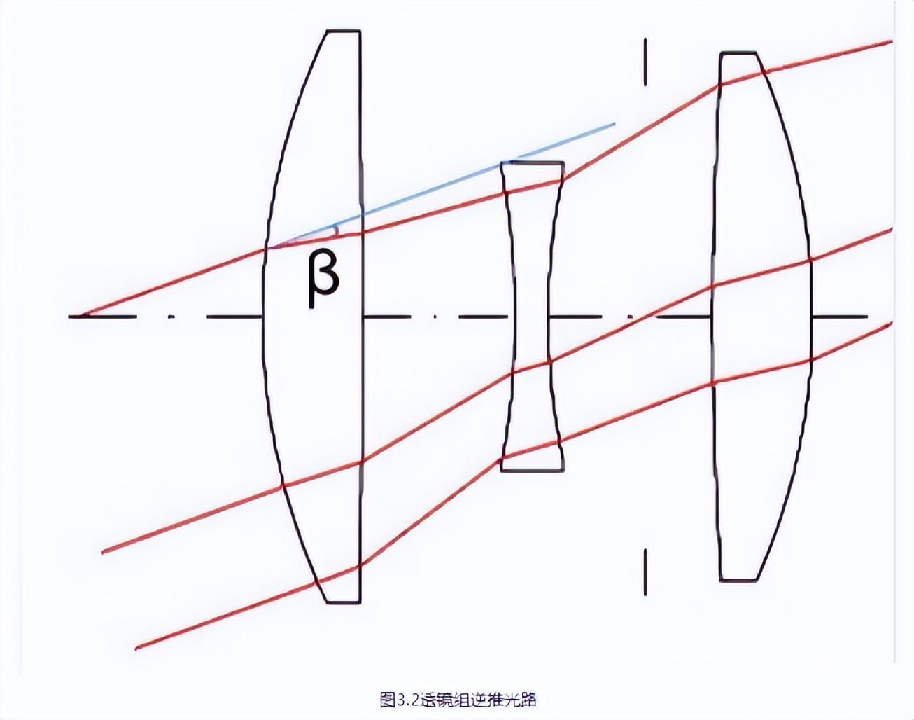 β为弯曲角,即光线的弯曲的角度。由于光路可逆我们同样根据β角与式(3)获得推论:即弯曲角越大,越偏离完美成像。再从色散角度分析,我们也可得出弯曲角越大色散越大,因此弯曲角越大,色差越大。