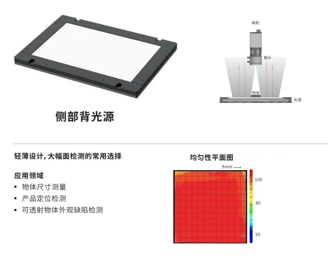 特点:侧部背光源通过侧向投光,能够显著突出目标物体的轮廓,形成鲜明的边缘对比,这有助于图像处理系统更精确地执行边缘检测算法。