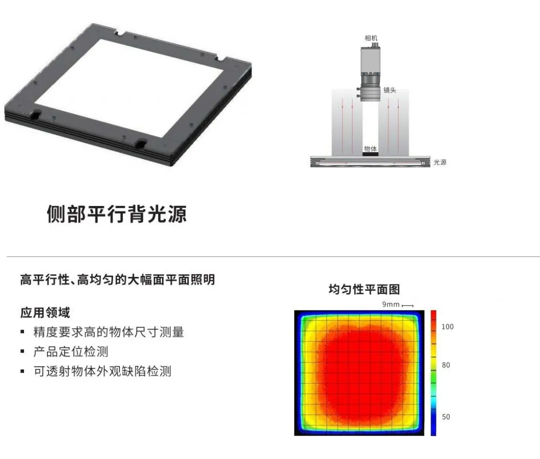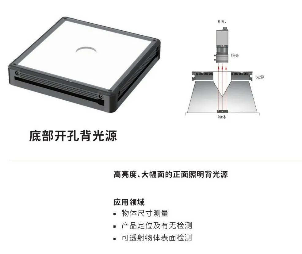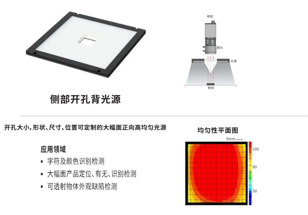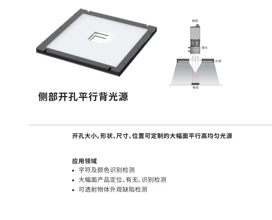 特点:侧部开孔背光源结合了背光照明的优势和中心开孔的设计,使得相机能够通过开孔直接观察目标,有效地减少光线干扰。