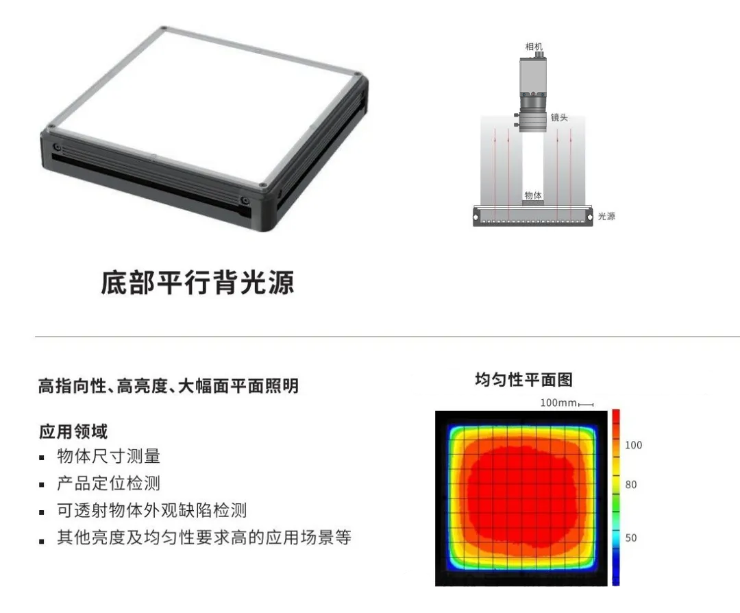 应用场景:这种光源尤其适合于需要高精度轮廓识别的工业应用,如金属零件的外形尺寸测量或塑料件的缺陷检查。