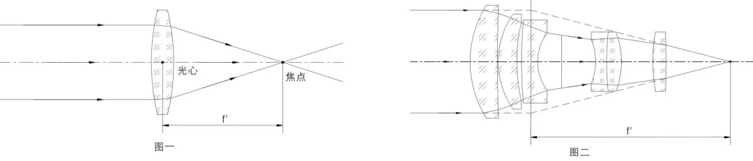 与光轴平行的光线射入凸透镜时,理想的镜头应该是所有的光线聚集在一点后,再以锥状扩散开来,这个聚集所有光线的点叫做焦点。对于单个透镜来说,焦距是指从光心到焦点的距离,如图一;对于多个透镜组成的镜头组来说,焦距是指像方主平面到焦点的距离,如图二。