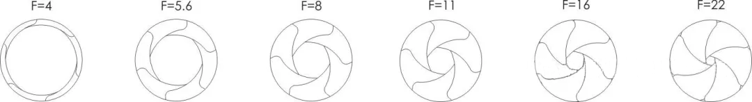 f/#值越小,光圈越大。一般f/#值是以√2倍递增,因此光圈常用的计数为F1.4,F2.0,F2.8,F4.0……在同一单位时间内上一级的通光面积是下一级的两倍,例如光圈从f/8调整到f/5.6,通光面积便增加一倍。