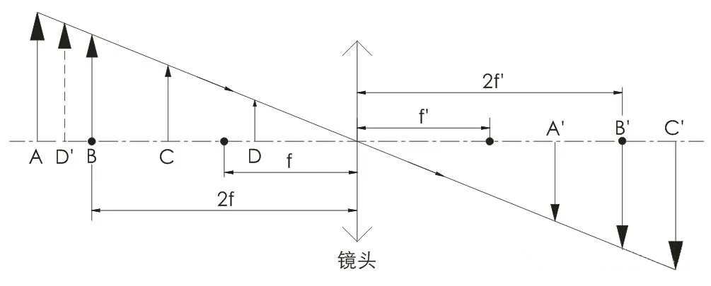 -1<β<0时,物像异侧,成倒立缩小的实像,如AA′所示,这就是镜头的成像原理。