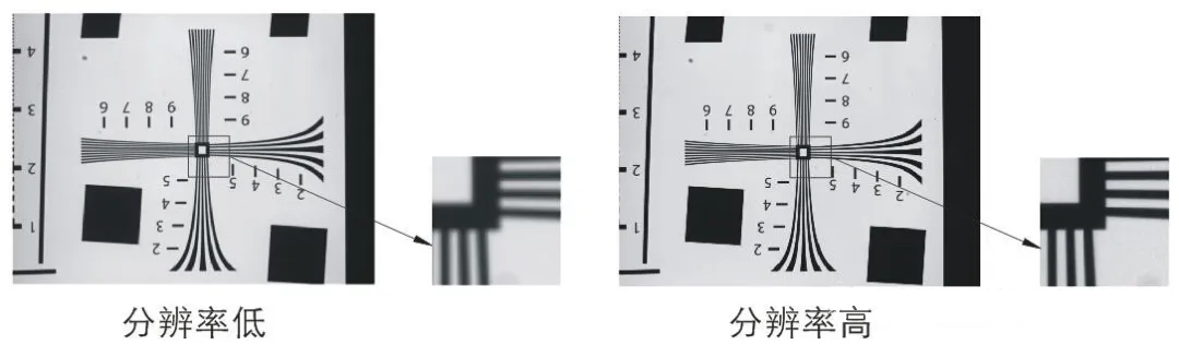 分辨率是指光学系统可以测到的被测物体上的最小可分辨特征尺寸。镜头能分辨物体的细节越小,镜头的分辨率就越高。通常用像面处每毫米能够分辨的黑白相间的条纹对数(lp/mm)描述。