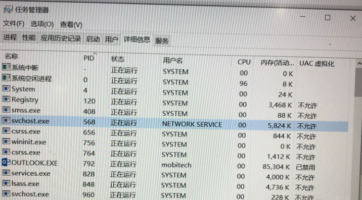 根据事件日志中给出来的信息,查找到名称,状态,用户名等更加详细的信息。PID是568,对应的是NETWORKSERVICE用户,应该是这个用户的权限问题。