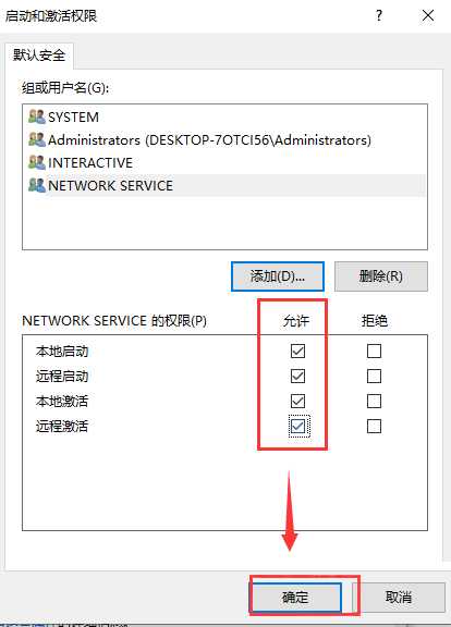 3、启动和激活权限(你可以编辑默认情况下允许启动应用程序或激活对象的用户。你也可以在应用程序上设置限制以决定其权限)–编辑默认值–添加NETWORKSERVICE–勾选允许所有权限,最后全部确定退出即可;