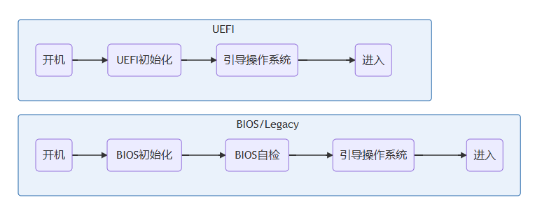 · 开机启动速度更快,更安全。下面比较一下UEFI和传统BIOS(Legacy)开机过程,省去了自检过程更快。