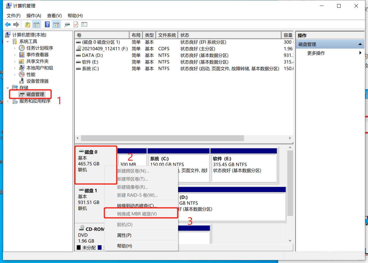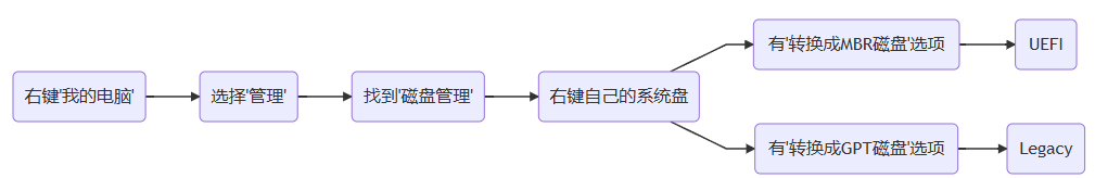 一种简单的方法是:右键“我的电脑”–>选择“管理”–>找到“磁盘管理”–>右键自己的系统盘–>查看是否有“转换成MBR磁盘”选项,如果是则为UEFI;如果是“转换成GPT磁盘”选项,则为Legacy。