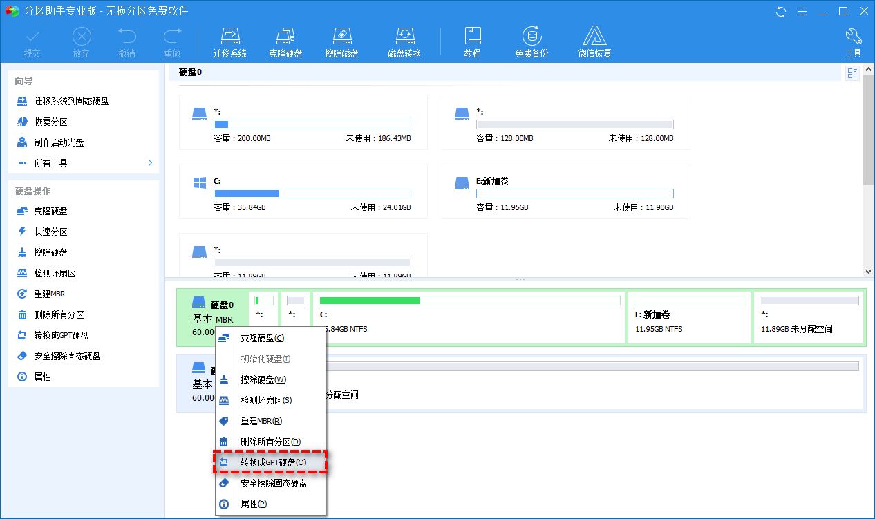 3、打开分区助手,选中你的磁盘右键“转换成GPT”,如果你电脑只有一块硬盘,那就选它就完事了,如果多块,找到你引导项所在的硬盘