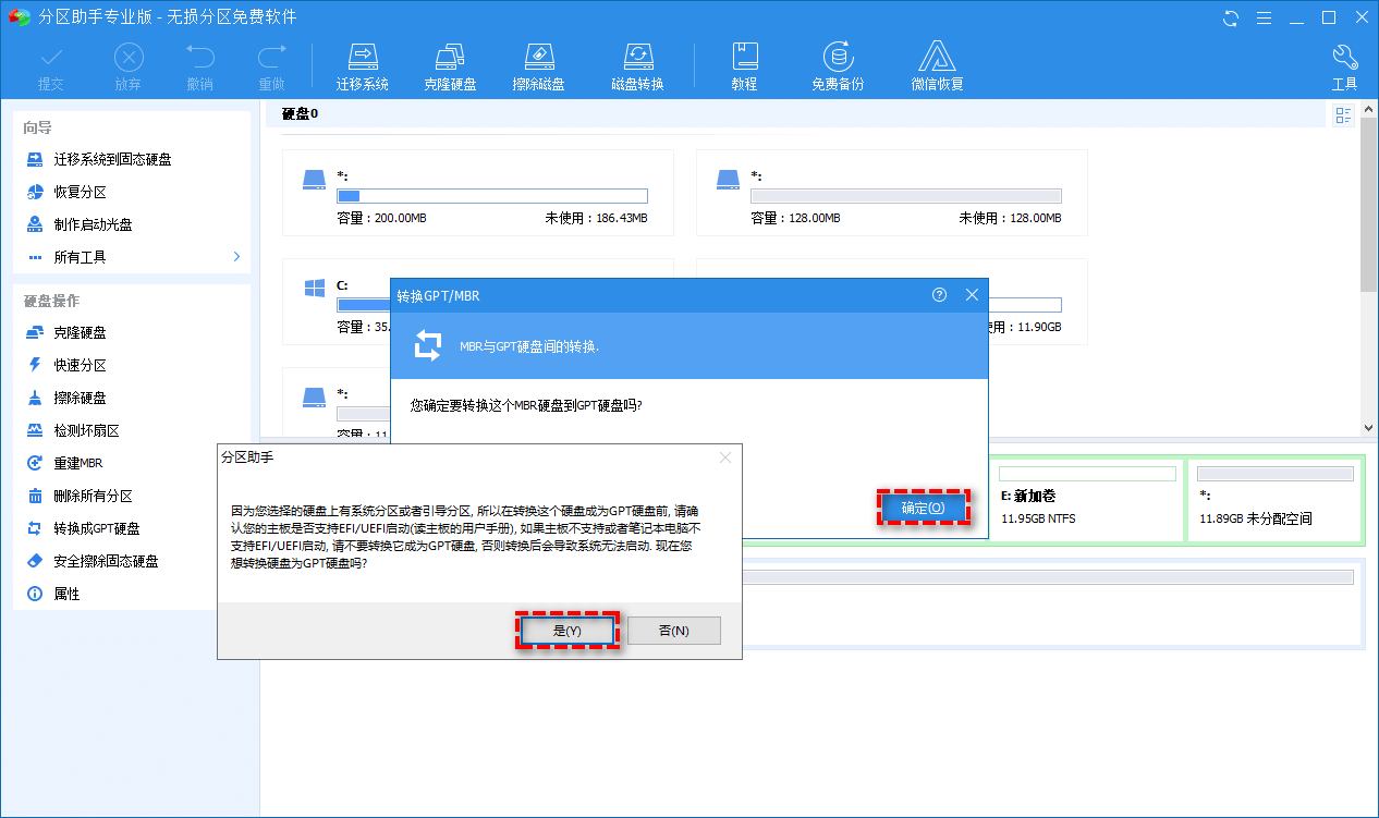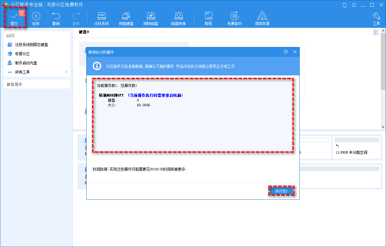 5、返回主界面,单击左上角“提交”按钮以预览即将进行的任务,确认无误后单击“执行”以开始将MBR转换成GPT磁盘